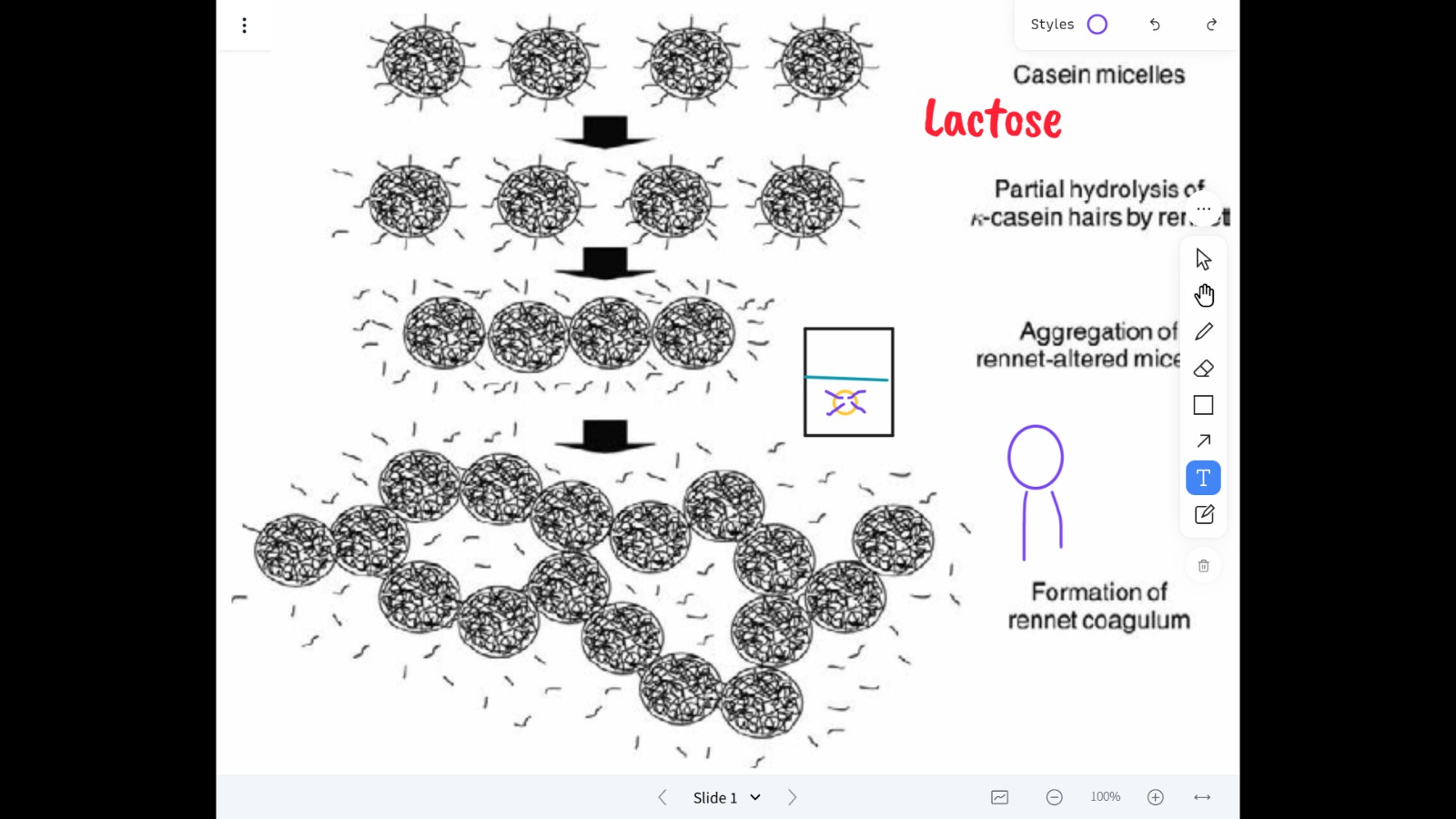 Rennet Coagulation: The enzyme rennet cleaves casein, leading to aggregation of casein micelles and formation of a gel-like curd structure. A step-by-step visual diagram was used to illustrate this transformation.