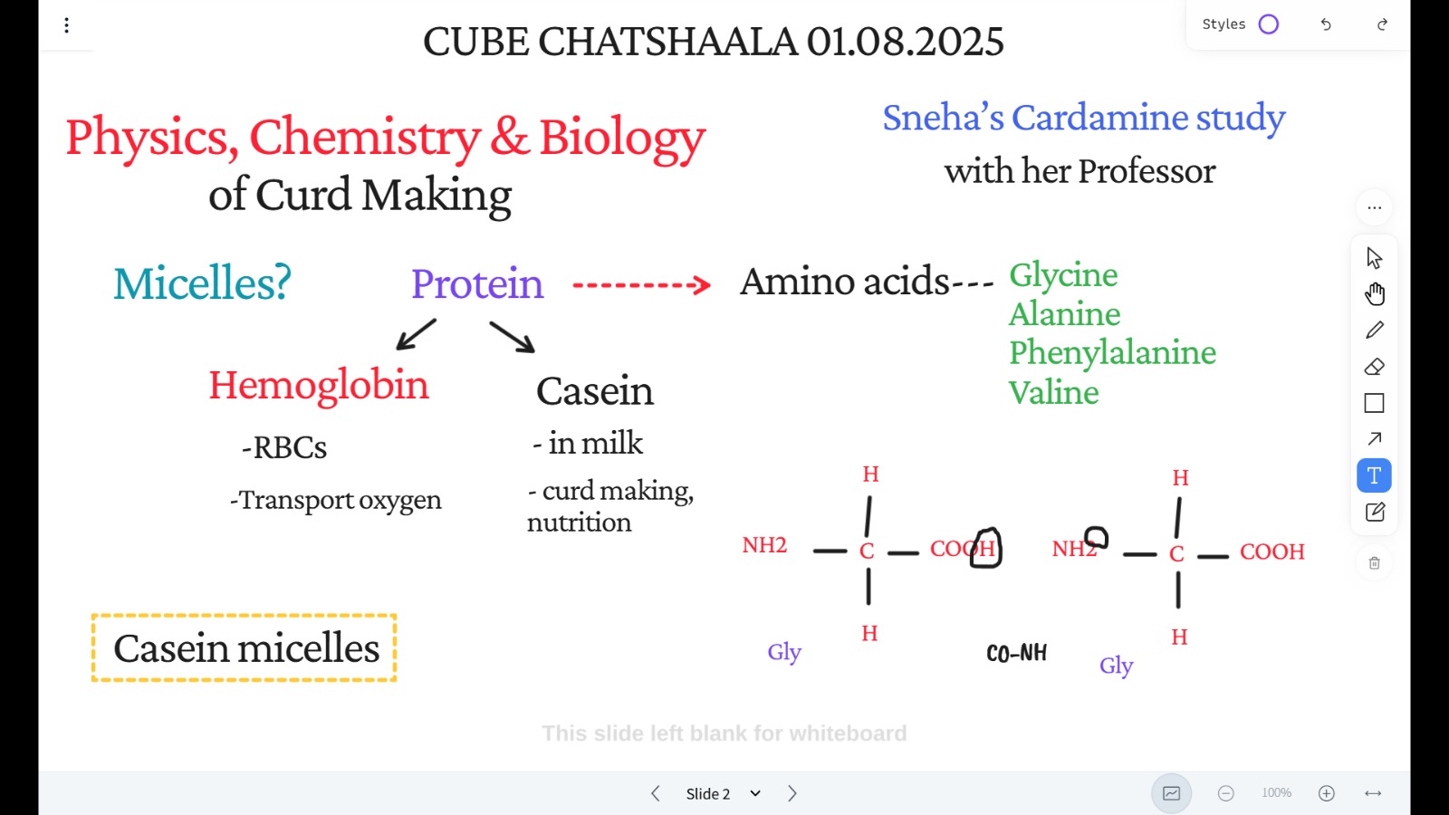 Today’s session made me realize that even common kitchen processes involve complex biochemical phenomena. I used to think curdling was simply a result of sourness. But now I understand that proteins like casein are engineered at the molecular level to maintain milk stability, and only with specific enzymatic or acidic triggers do they clump into curd. The role of micelle structures and amino acids made me appreciate how everyday actions are tied to invisible, elegant science.