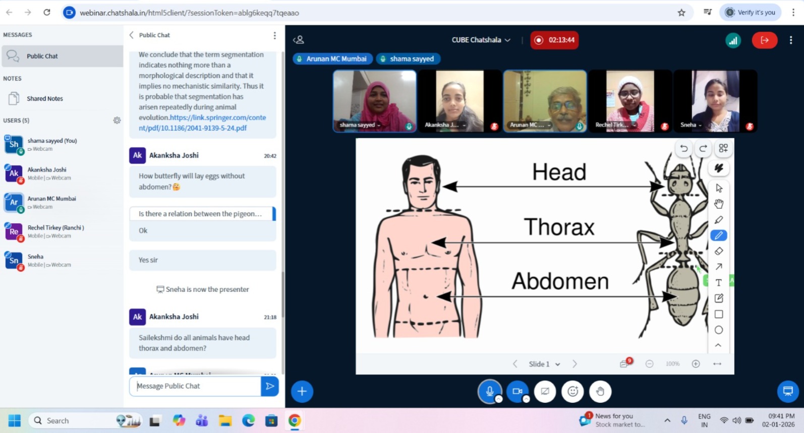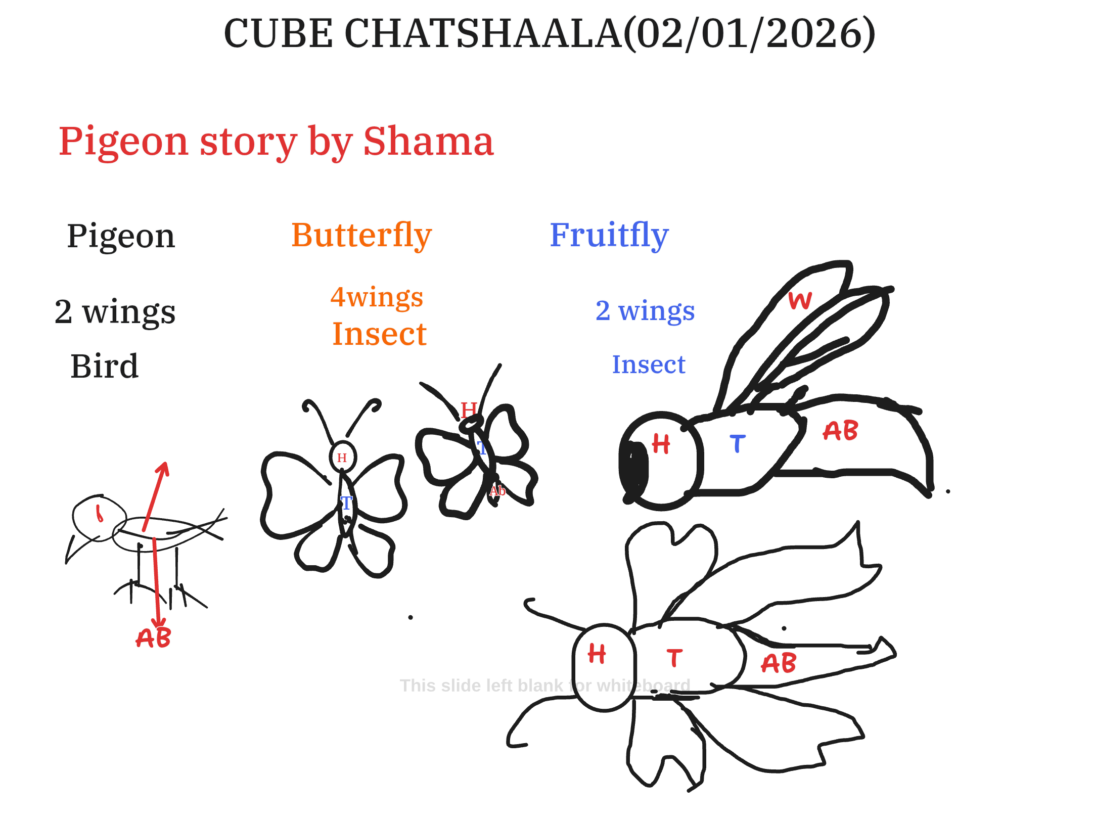 The ChatShaala session centered on understanding body plan organization across organisms through a simple yet powerful narrative approach. Using the “Pigeon Story” shared by Shama as a starting point, the discussion moved fluidly across birds and insects to highlight how structural similarities and differences reflect function, classification, and evolution. The whiteboard illustrations played a key role in grounding abstract biological concepts in visual reasoning.