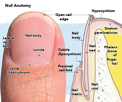 - Cuticle (Eponychium) — the thin skin sealing the proximal nail fold